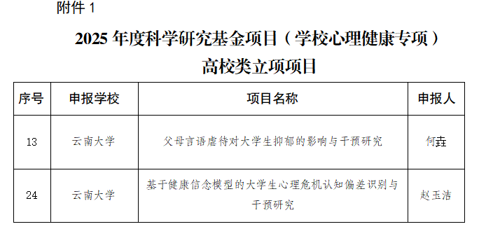 根据《云南省教育厅关于公布2025年度科学研究基金项目(学校心理健康教育专项)立项项目的通知》,我校心理健康咨询服务中心组织申报的2个研究项目获批立项。根据《云南省教育厅关于开展2025年度科学研究基金项目(高校毕业生就业研究专项、学校心理健康教育专项)申报工作的通知》要求,经单位申报、材料审查、专家评审和公示,共评选出2025年度云南省教育厅科学研究基金项目(学校心理健康教育专项)高校类30项、中小学类30项。