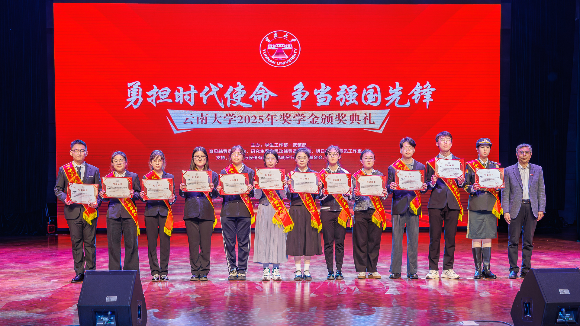 2025年12月29日,云南大学2025年奖学金颁奖典礼在呈贡校区举行。典礼以“勇担时代使命,争当强国先锋”为主题,集中表彰2025年度在学习科研、社会实践、志愿服务、创新创业等方面表现突出的先进集体和个人,激励全体云大学子恪守“会泽百家、至公天下”的办学精神,践行“自尊、致知、正义、力行”的校训,努力成长为担当民族复兴大任的时代新人。