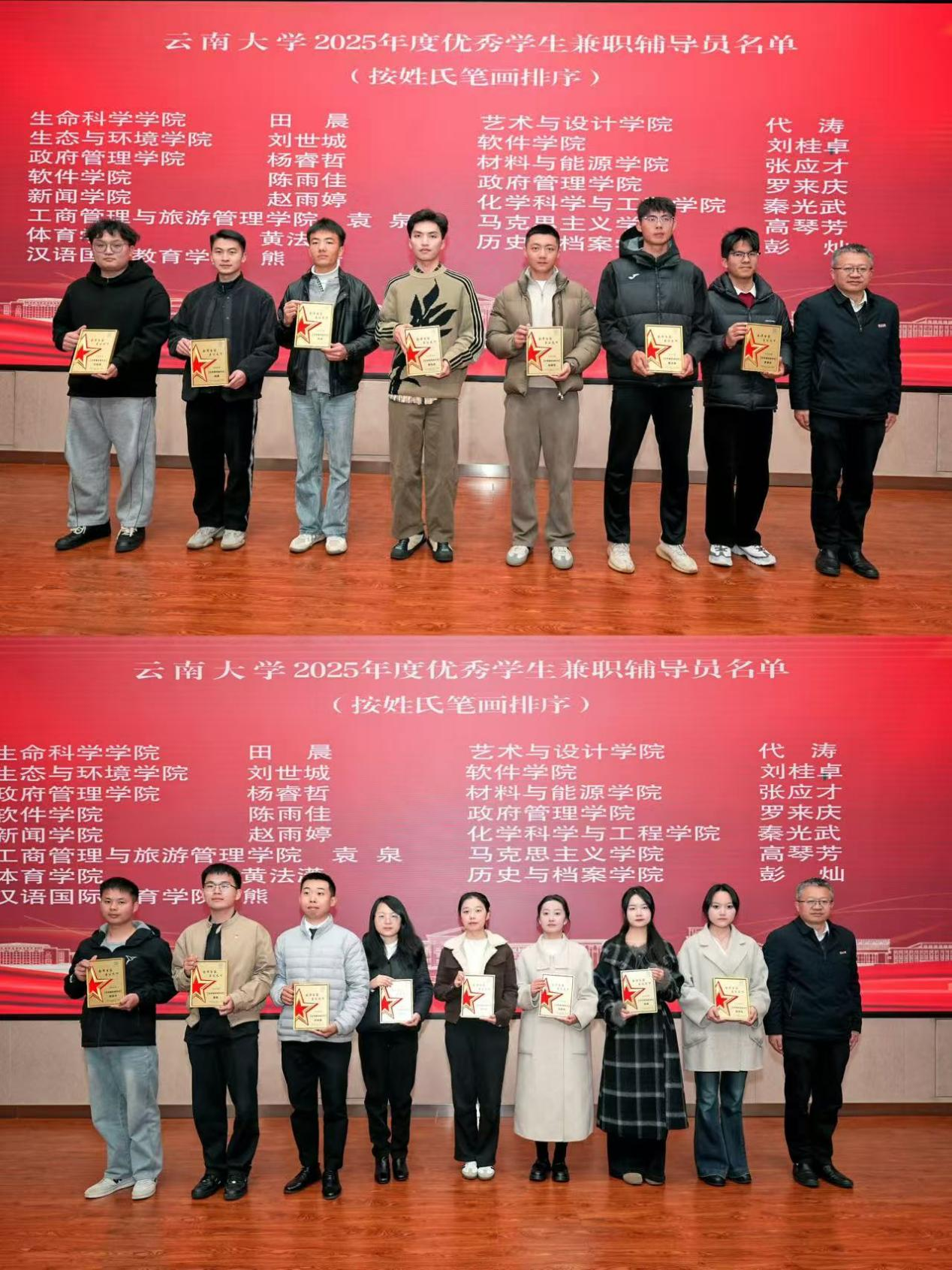 会议还表彰了云南大学第十四届辅导员素质能力大赛获奖人员及2025年度优秀专兼职辅导员,树立典型,激励先进。